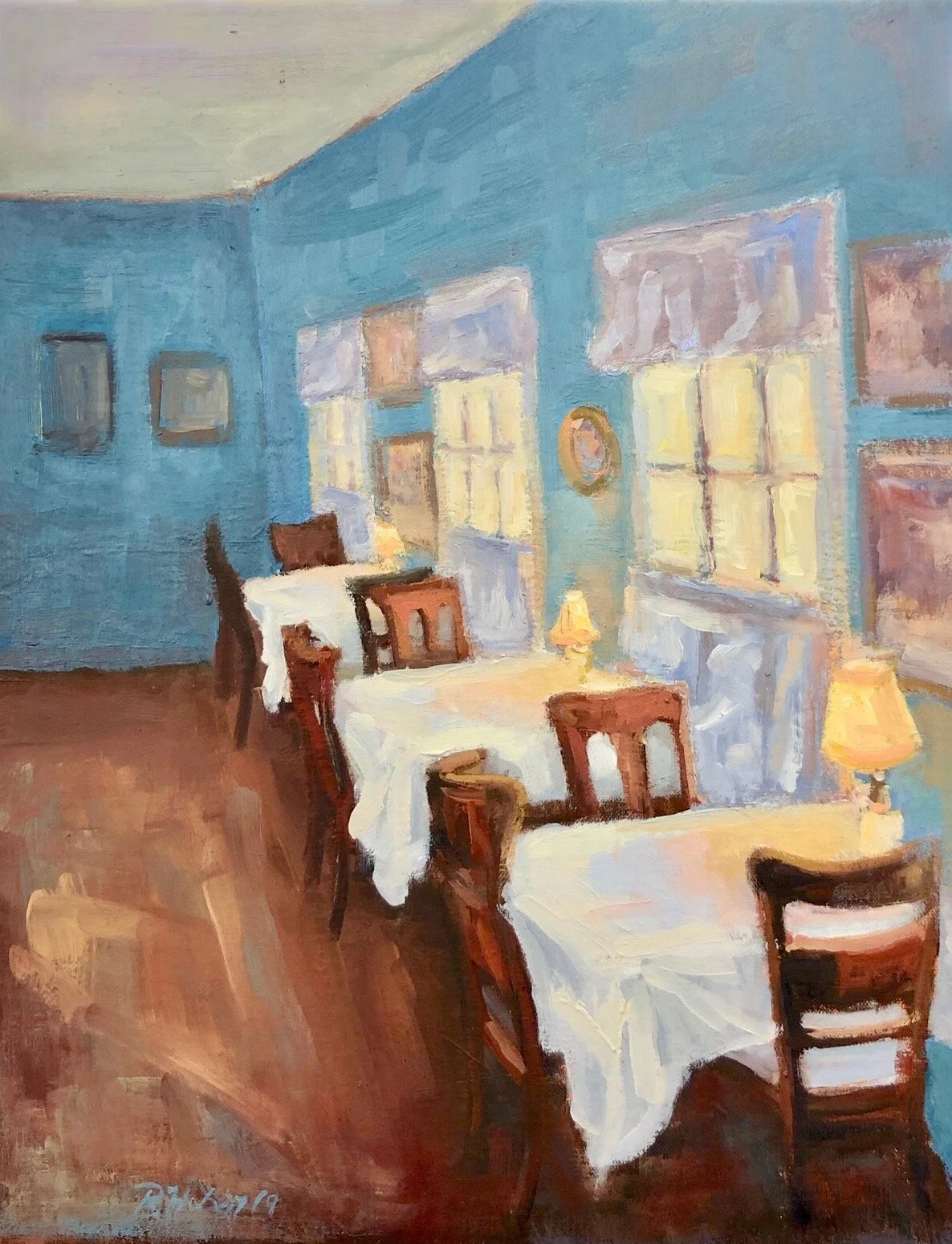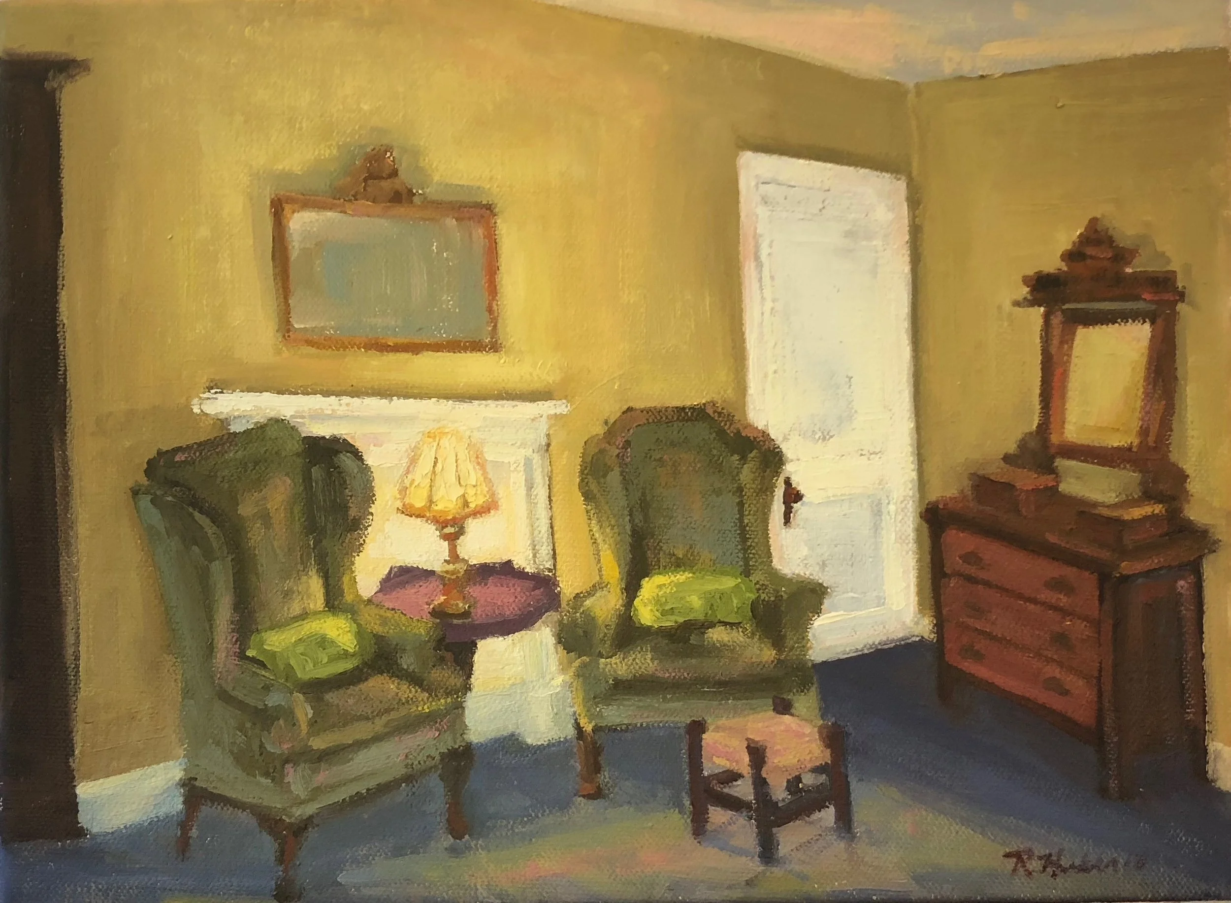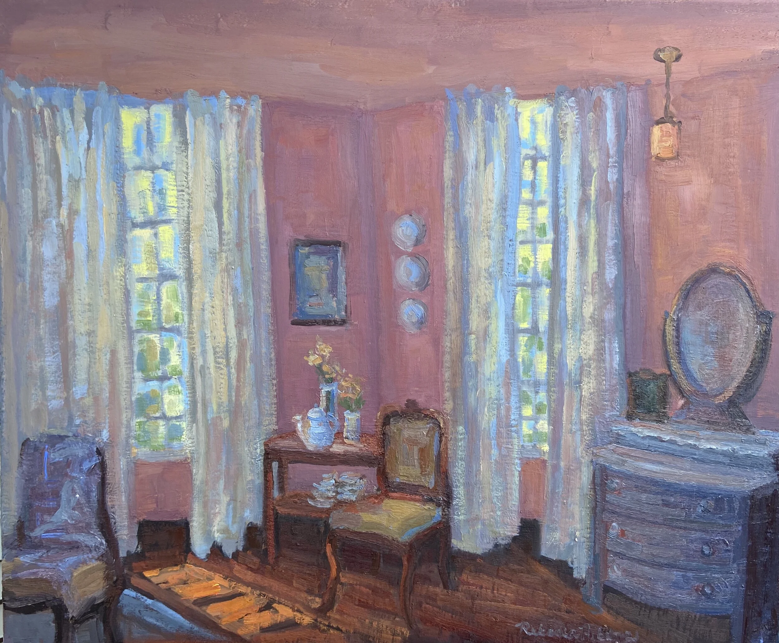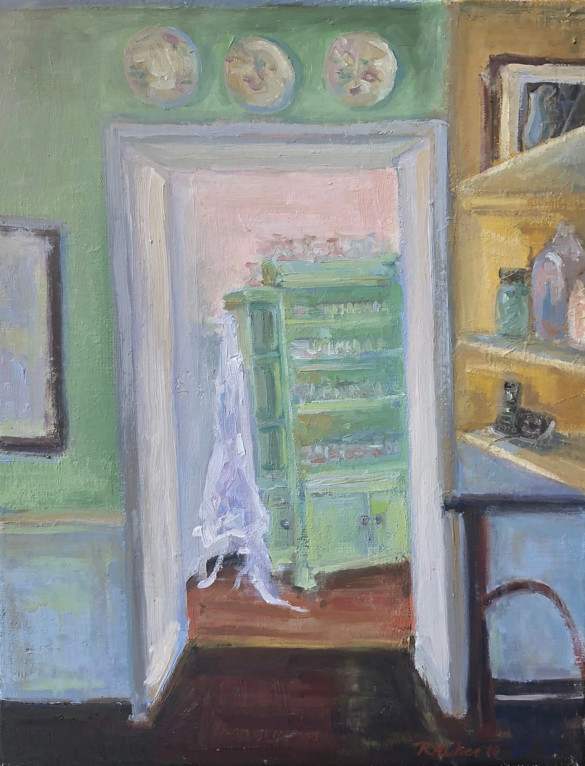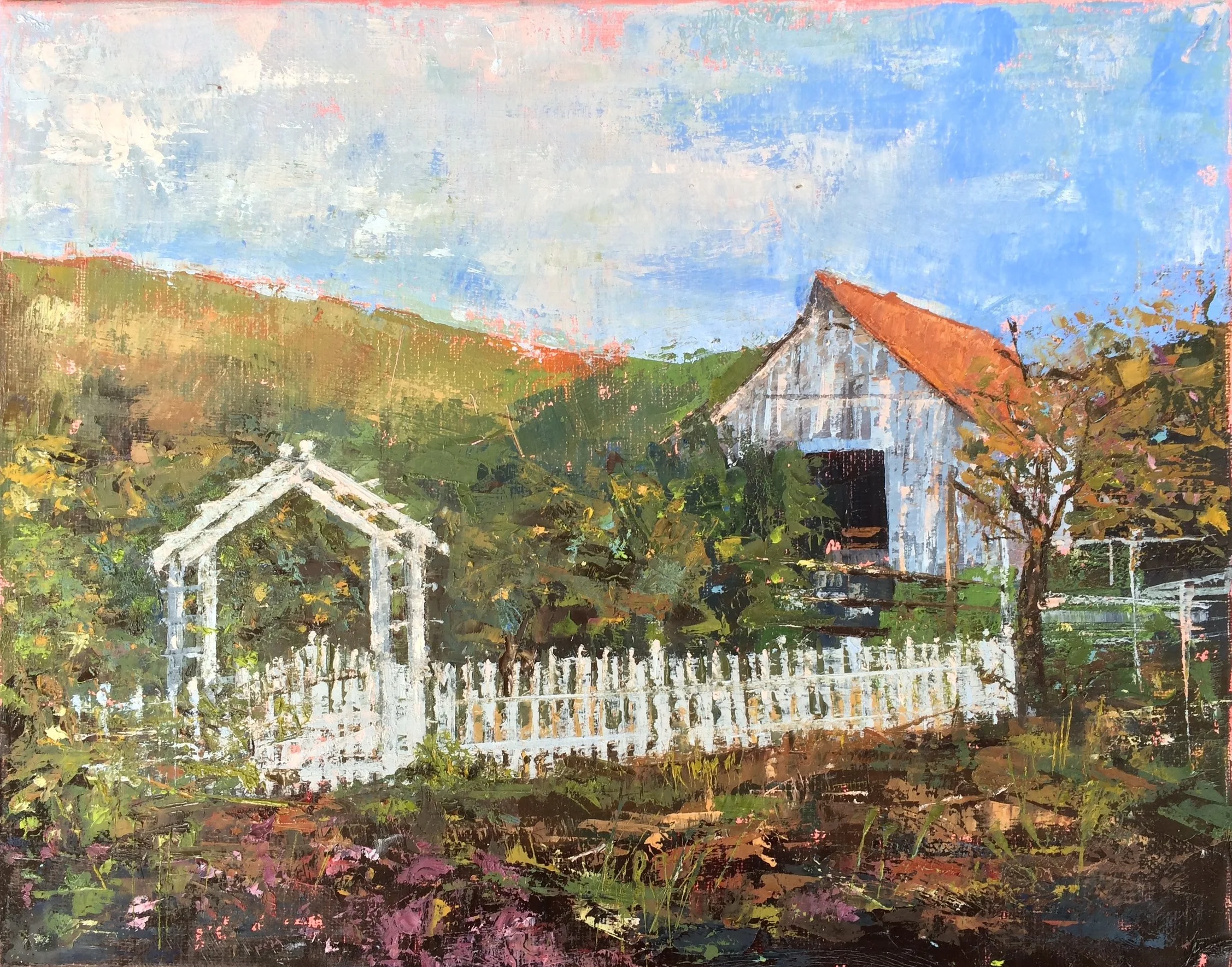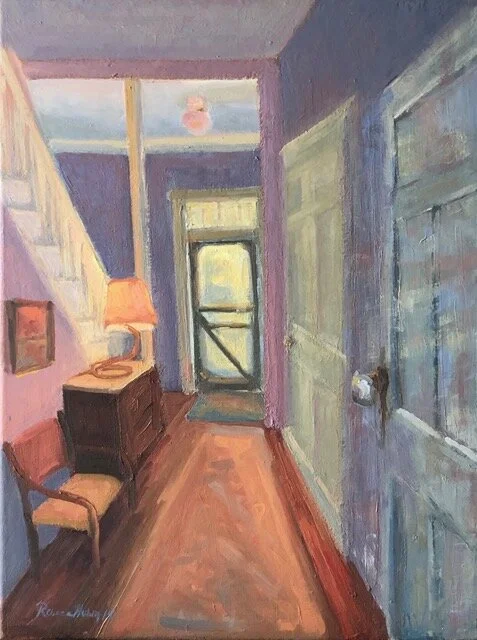 I am a painter of historical fiction. Inspired by the strength and charm of old garden gates, cottage interiors with crooked windows and painted, warn floorboards from years of good company. These are reminders of simpler times where stories and memories come from. My work also reflects calm and picturesque moments found in early morning beach walks, children splashing in the ocean, dogs fetching sticks, trickling streams and hidden paths. My palette knives, brushes and oil paints layer fresh, earthy colors and give texture, creating realistic impressions and capturing a feeling of place and time. The perspective used in my landscape and interior paintings bring you to places I have traveled and are reminders of beauty that surrounds us. All we really need are the unwrapped gifts found in our homes and outside the kitchen door.